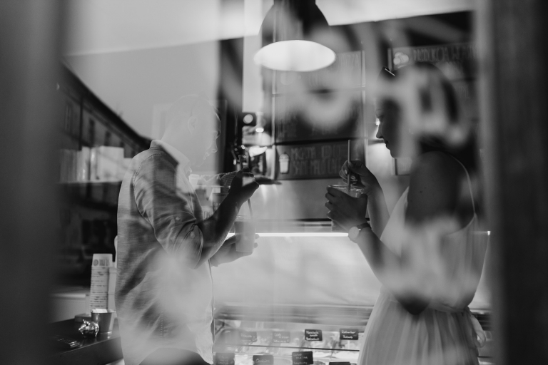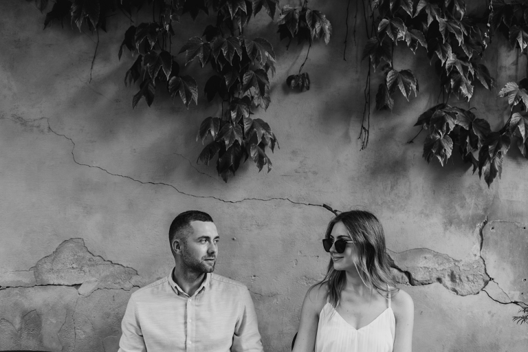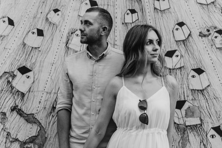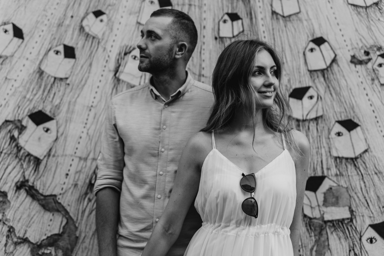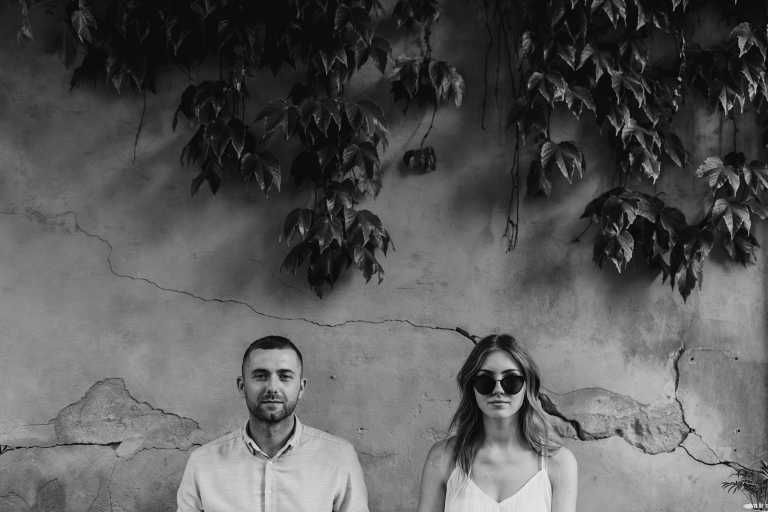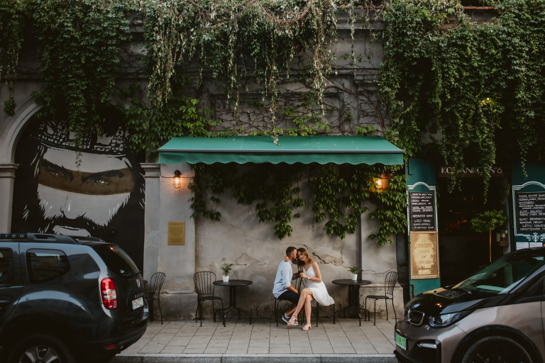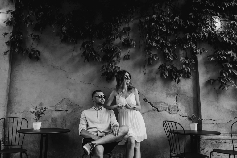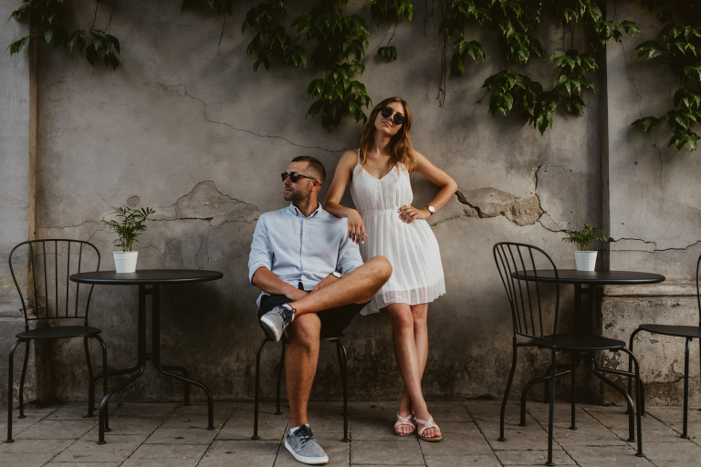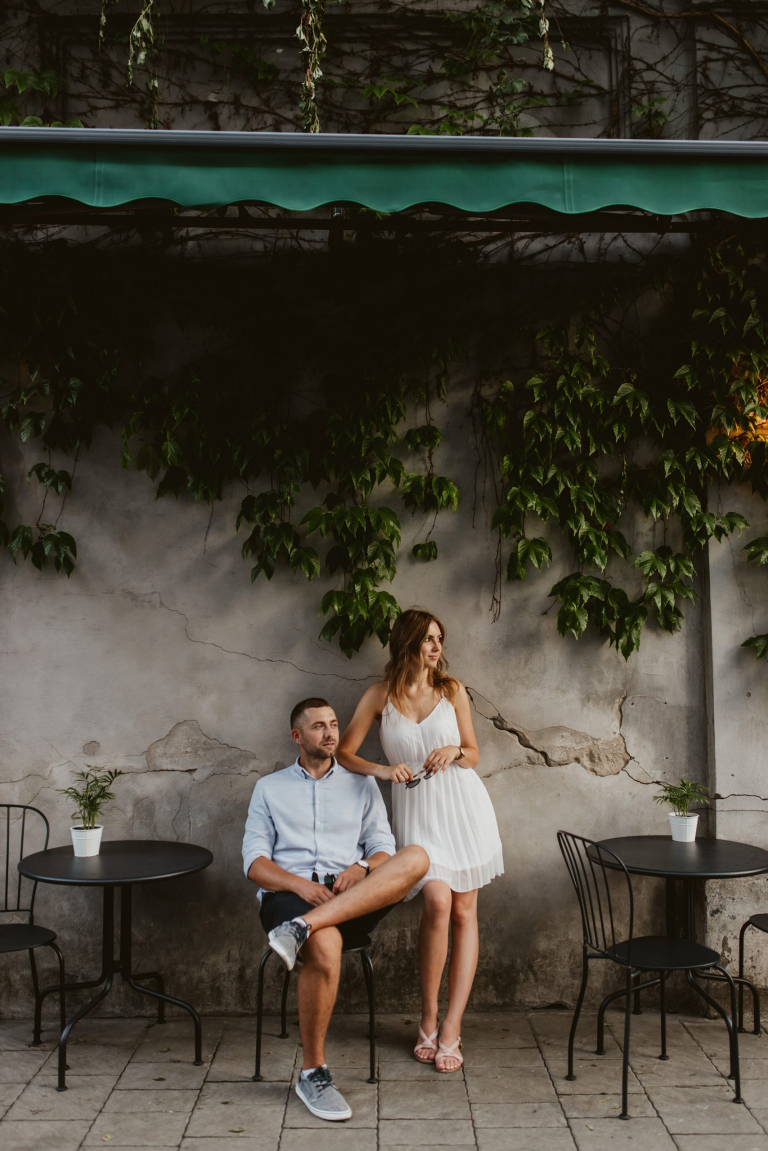 Podczas spaceru szukaliśmy miejsc z duszą. Zatrzymywaliśmy się przy muralach, surowych ścianach, starych bramach i kawiarniach z zielonymi markizami. Wszystko działo się naturalnie, bez sztywnego pozowania. Światło popołudniowego słońca robiło swoje – złapało nas dokładnie wtedy, gdy trzeba było, a my byliśmy gotowi, by to uchwycić.