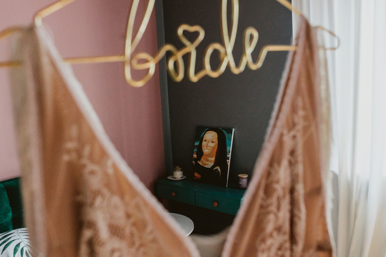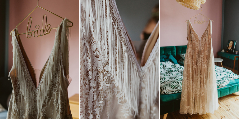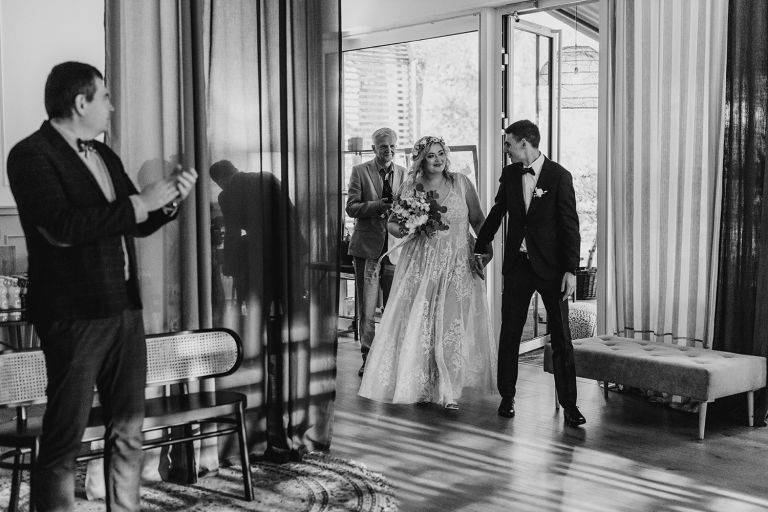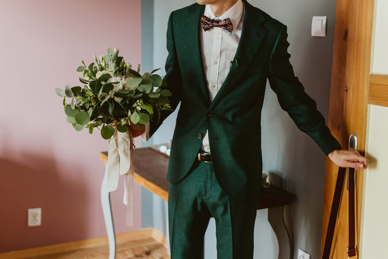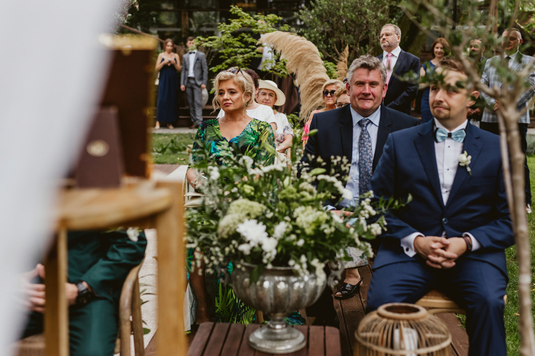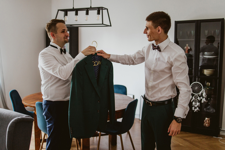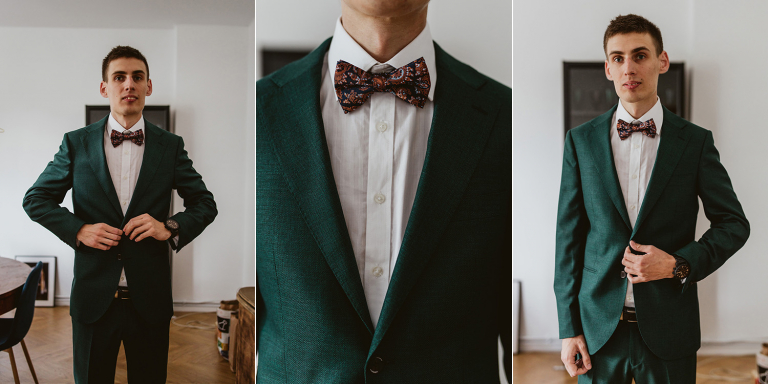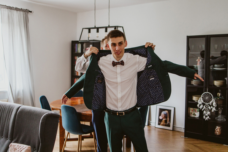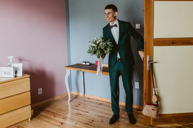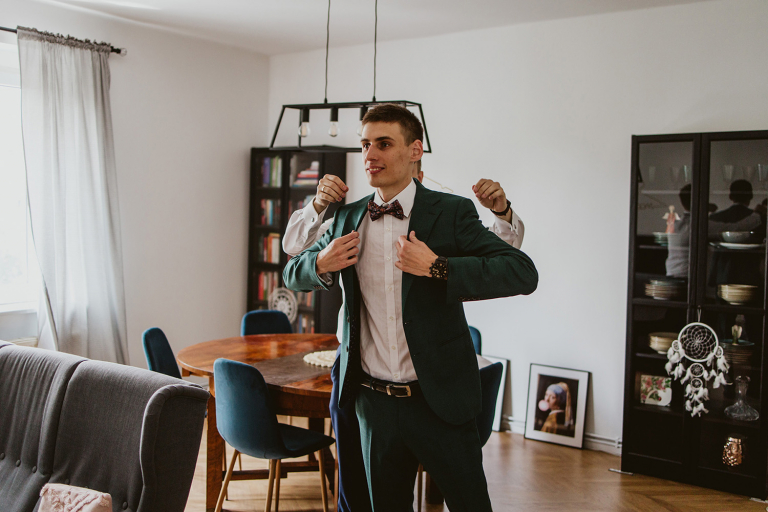 Przygotowania do ceremonii odbyły się w pięknym, przestronnym mieszkaniu Pary Młodej. Jego wnętrza absolutnie nas urzekły! Dekoracje to samodzielne dzieło Agaty – twist nowoczesności i elementów vintage, który wyczarowała, dał wyjątkowy efekt. Choć główną rolę grają w tym mieszkaniu meble (tak pięknie odnowiony stół, kredens czy konsolę chętnie widzielibyśmy we własnym domu!), jego klimat najmocniej definiują dodatki: miękkie tekstylia, kryształy rodem z PRL-u, ceramika w przeszklonym kredensie czy oprawione w ramy grafiki. Dzięki nim wnętrza są oryginalne i stylowe, ale w naturalny, swobodny i niewymuszony sposób.