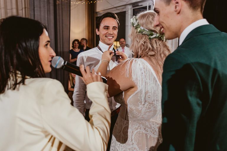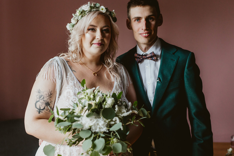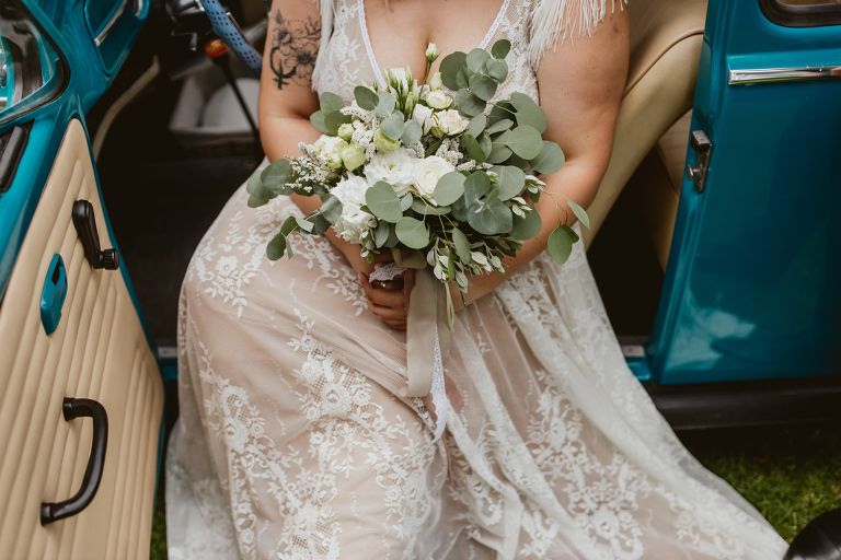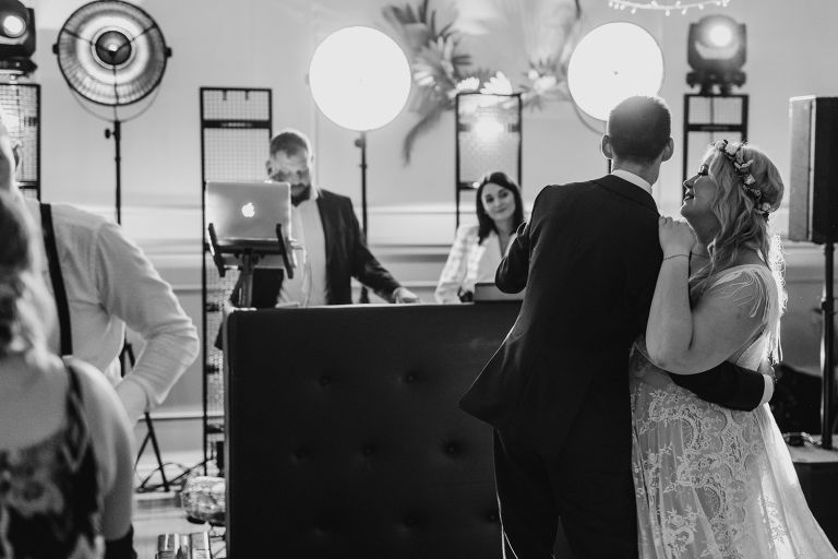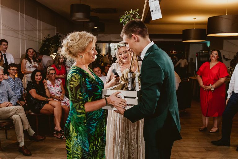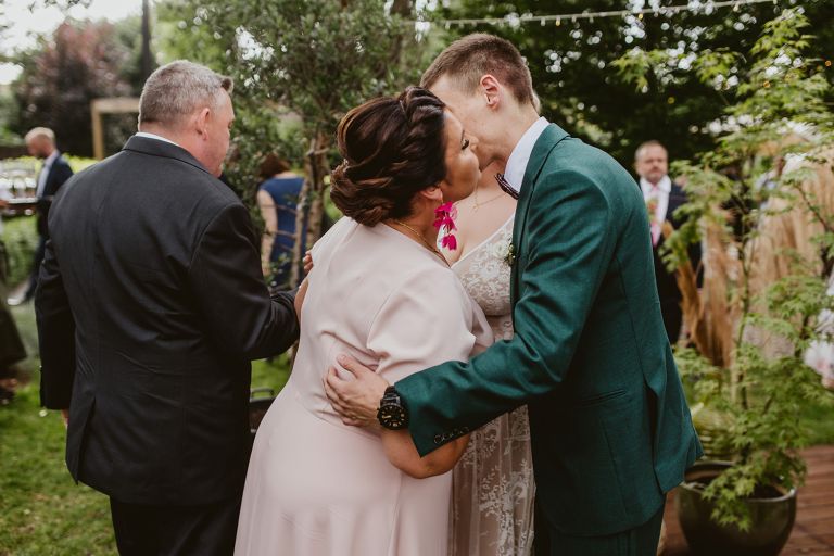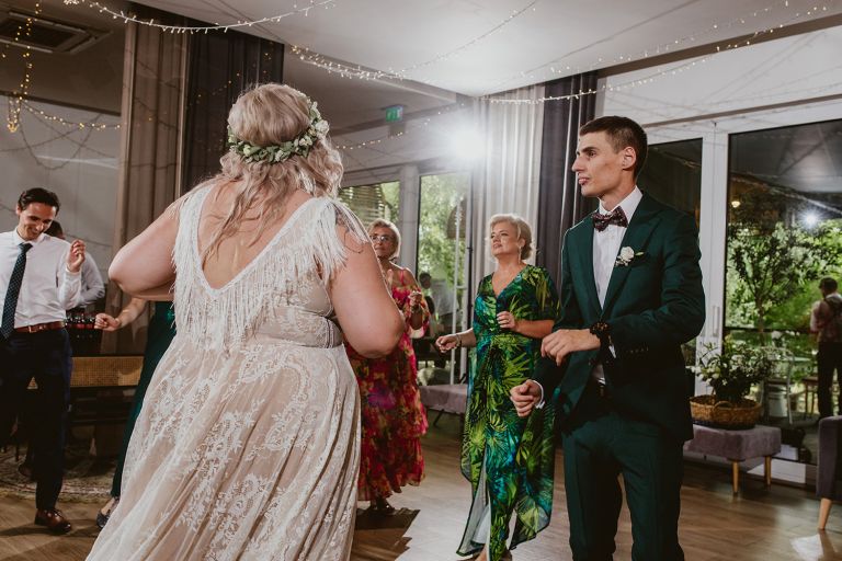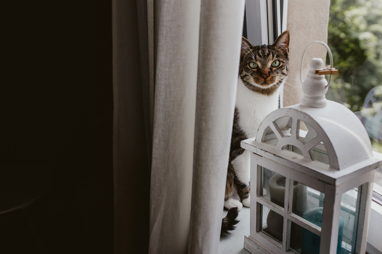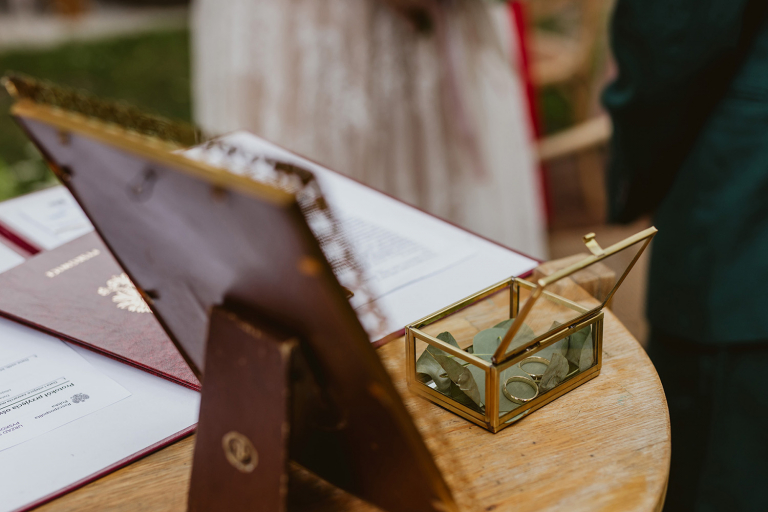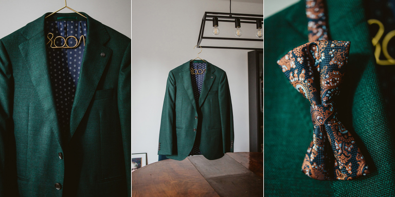 Przygotowania do ceremonii odbyły się w pięknym, przestronnym mieszkaniu Pary Młodej. Jego wnętrza absolutnie nas urzekły! Dekoracje to samodzielne dzieło Agaty – twist nowoczesności i elementów vintage, który wyczarowała, dał wyjątkowy efekt. Choć główną rolę grają w tym mieszkaniu meble (tak pięknie odnowiony stół, kredens czy konsolę chętnie widzielibyśmy we własnym domu!), jego klimat najmocniej definiują dodatki: miękkie tekstylia, kryształy rodem z PRL-u, ceramika w przeszklonym kredensie czy oprawione w ramy grafiki. Dzięki nim wnętrza są oryginalne i stylowe, ale w naturalny, swobodny i niewymuszony sposób.