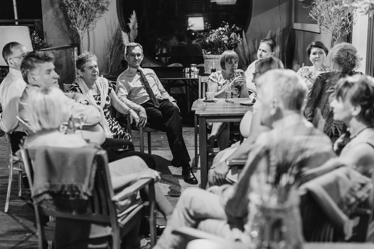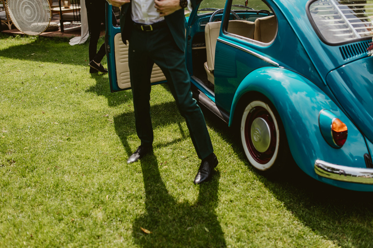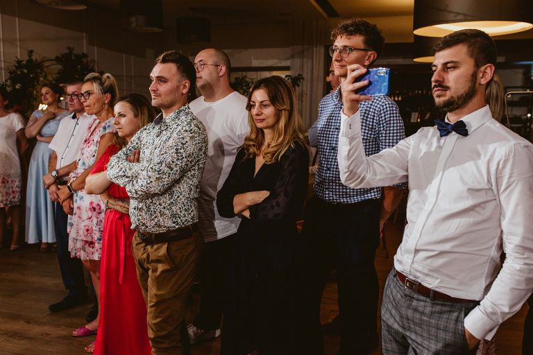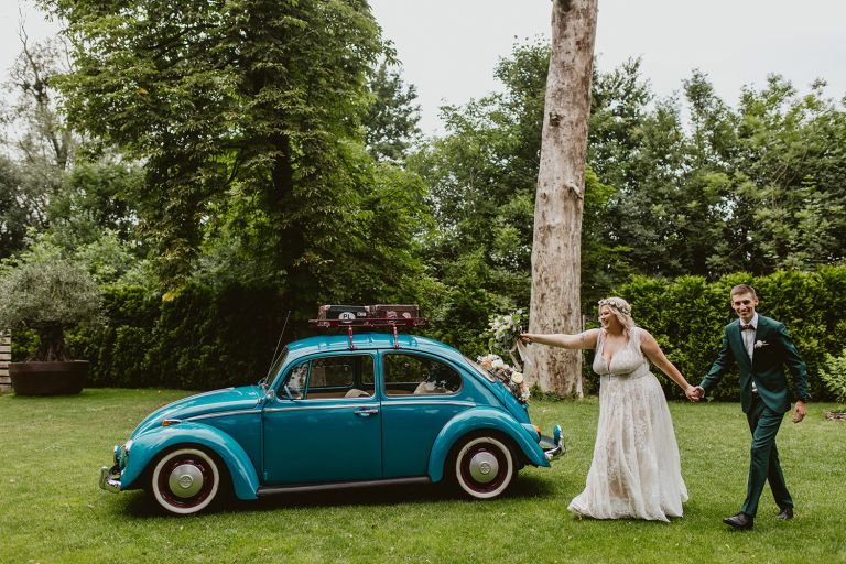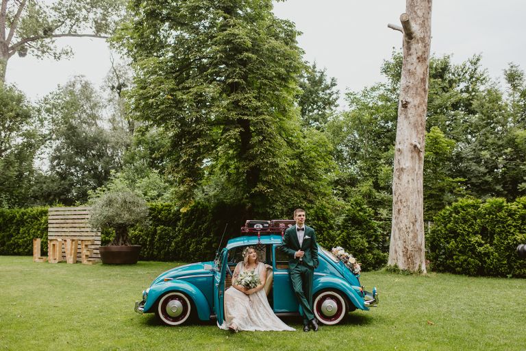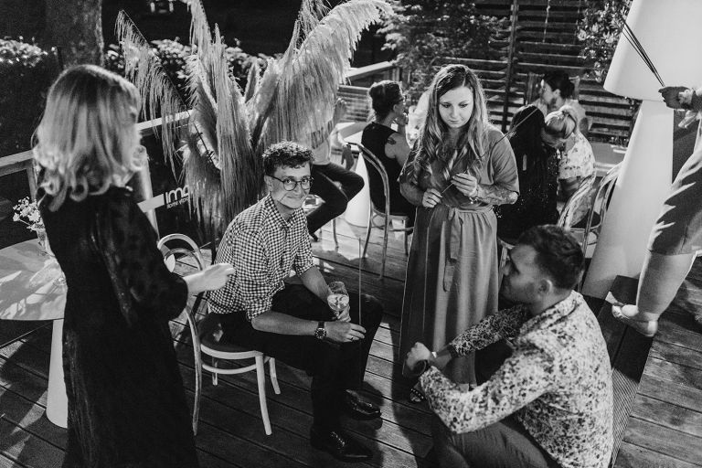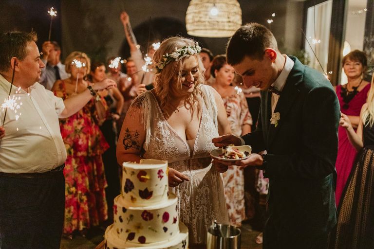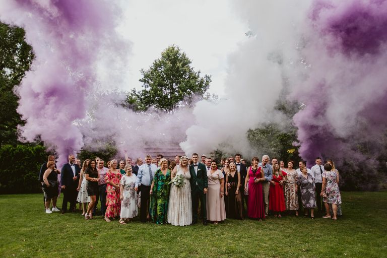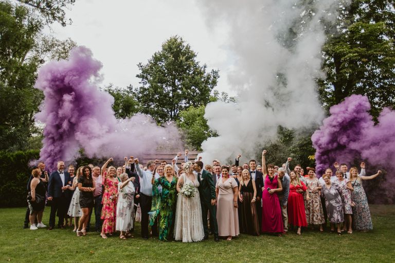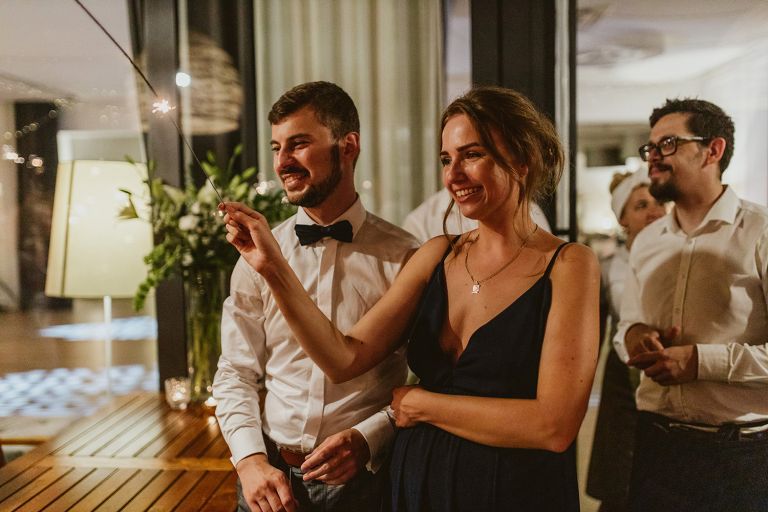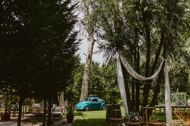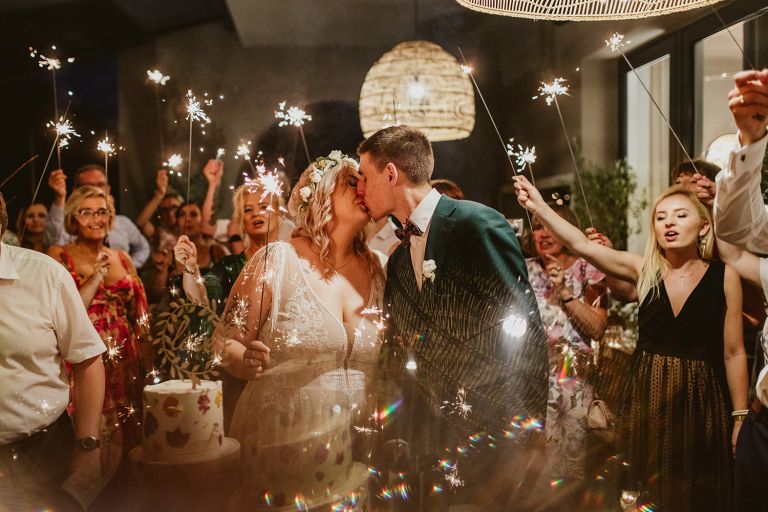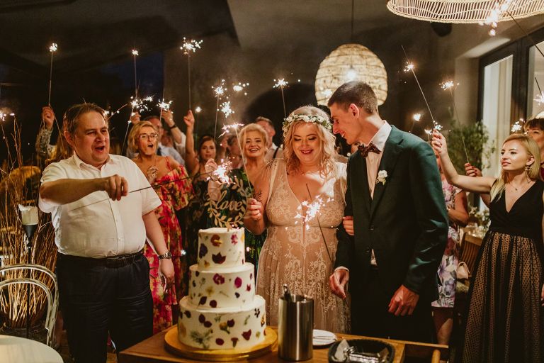 Choć przyjęcie nie odbywało się na świeżym powietrzu, a w restauracji (podporządkowanie się ciszy nocnej mogłoby być trudne na zewnątrz, bo rewelacyjną jak zwykle imprezę rozkręcili Sara i Krzysiu z Eventino!), ogród i tak pozostawał ważnym miejscem akcji. W trakcie przyjęcia porwaliśmy Młodych na krótką sesję – dodatkowym bohaterem tych zdjęć stał się niebieski VW Garbus, którym Agata i Piotr przyjechali na miejsce. Świetnie dopasował się do klimatu Umami, stylistyki całego wesela i… charakterów naszej Młodej Pary. Był tak jak oni – uroczy i oryginalny 🙂 W ogrodzie wykonaliśmy również zdjęcia grupowe z efektownymi fioletowymi racami. Na świeżym powietrzu podano też tort – zdjęcia upiększyło towarzystwo zimnych ogni.