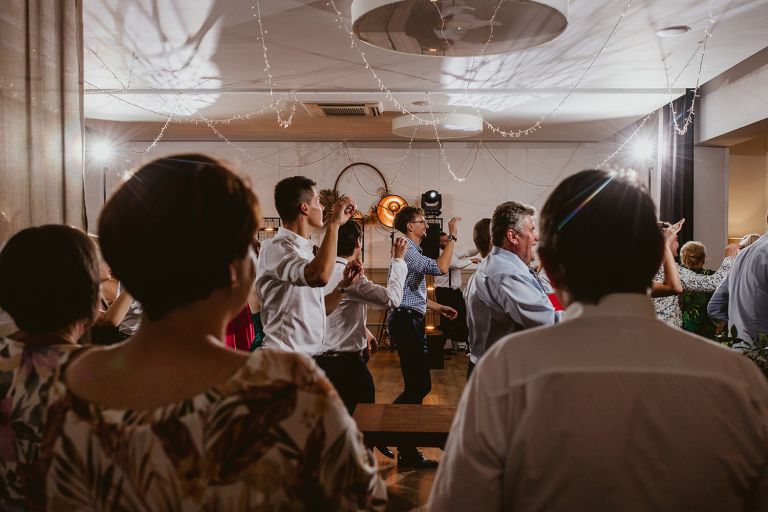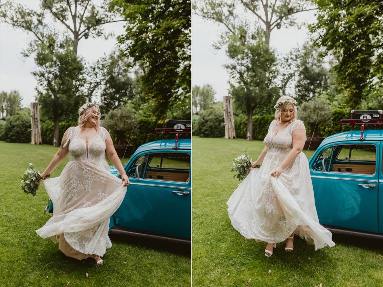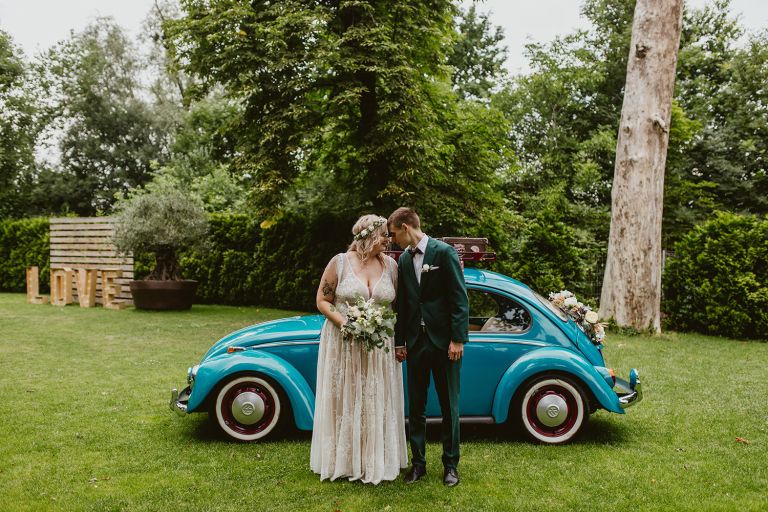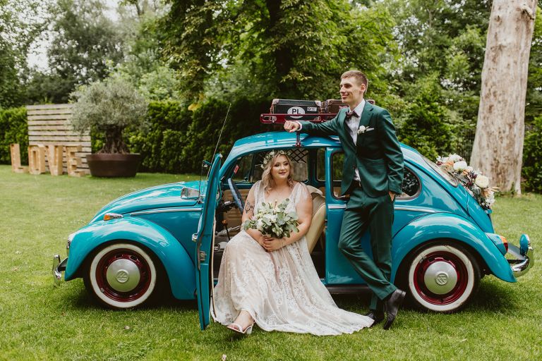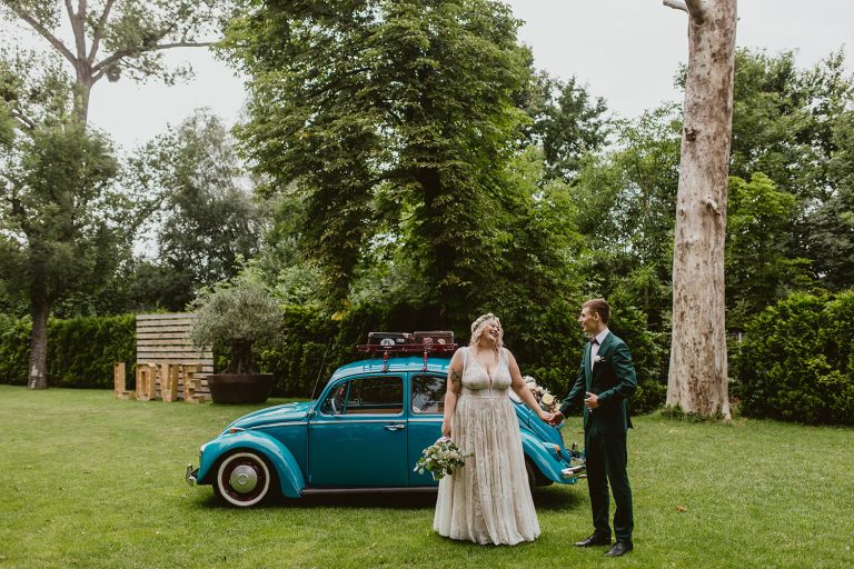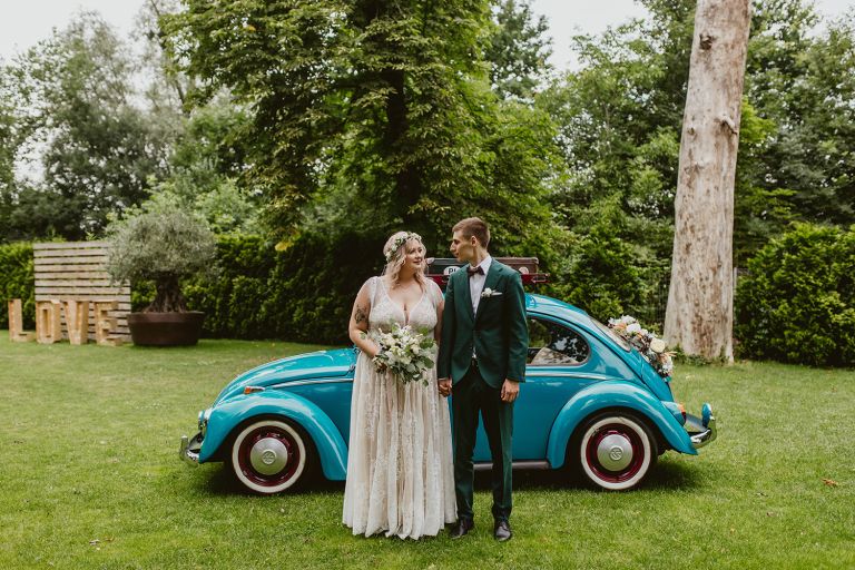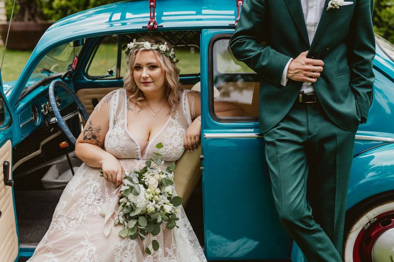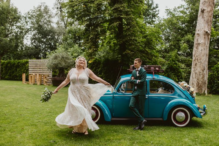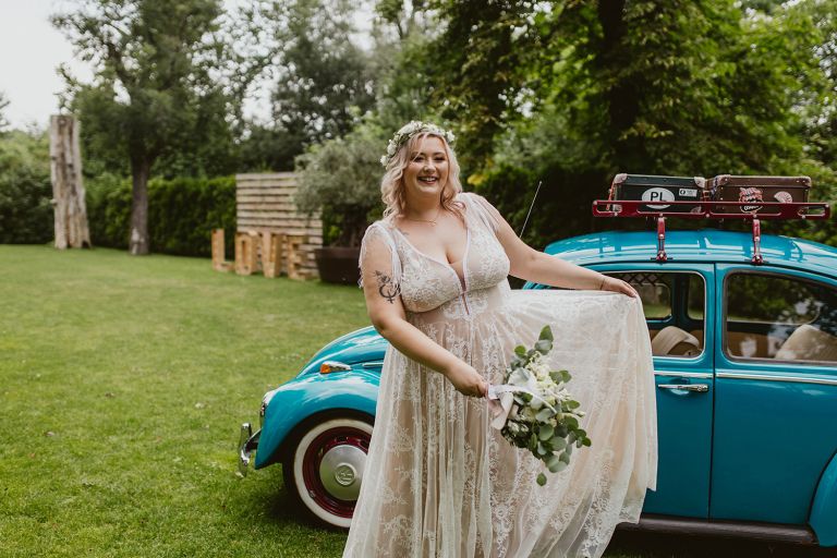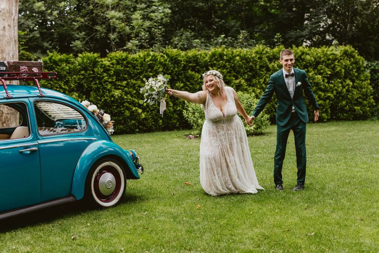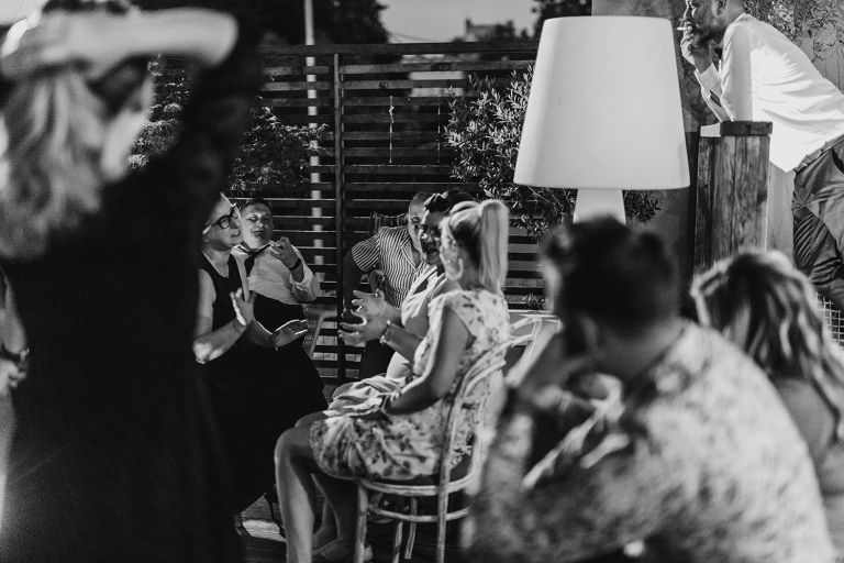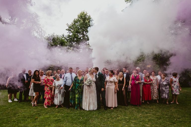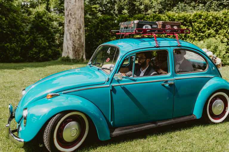 Choć przyjęcie nie odbywało się na świeżym powietrzu, a w restauracji (podporządkowanie się ciszy nocnej mogłoby być trudne na zewnątrz, bo rewelacyjną jak zwykle imprezę rozkręcili Sara i Krzysiu z Eventino!), ogród i tak pozostawał ważnym miejscem akcji. W trakcie przyjęcia porwaliśmy Młodych na krótką sesję – dodatkowym bohaterem tych zdjęć stał się niebieski VW Garbus, którym Agata i Piotr przyjechali na miejsce. Świetnie dopasował się do klimatu Umami, stylistyki całego wesela i… charakterów naszej Młodej Pary. Był tak jak oni – uroczy i oryginalny 🙂 W ogrodzie wykonaliśmy również zdjęcia grupowe z efektownymi fioletowymi racami. Na świeżym powietrzu podano też tort – zdjęcia upiększyło towarzystwo zimnych ogni.