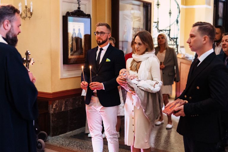 Chrzest prawosławny to uroczystość wyjątkowa – zarówno pod względem duchowym, jak i wizualnym. Pełna głębokich znaczeń i tradycji, składa się z trzech części. Pierwsza – Katechizm – odbywa się w narteksie (czyli w wejściu do cerkwi) i obejmuje recytację Symboli Wiary. Druga to kulminacyjny moment – dziecko zostaje namaszczone przez rodziców, a kapłan trzykrotnie zanurza je w chrzcielnicy. Trzecia część to Sakrament Bierzmowania: namaszczenie krzyżmem, postrzyżyny i przekazanie białej szatki.