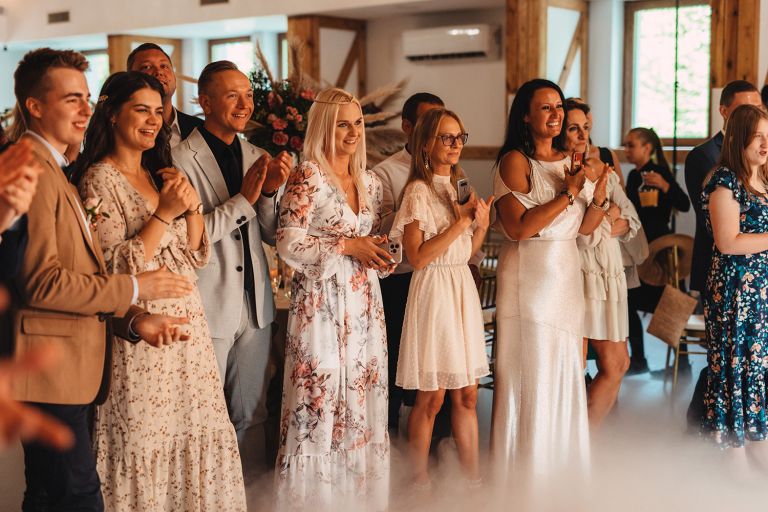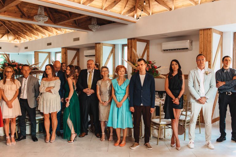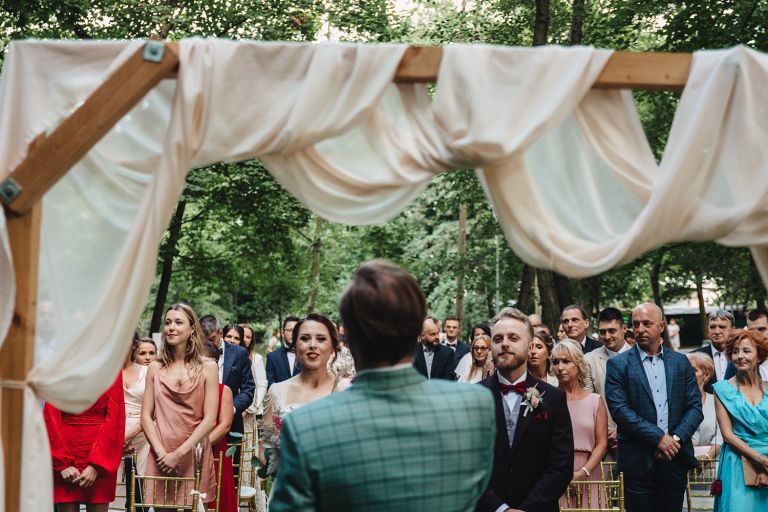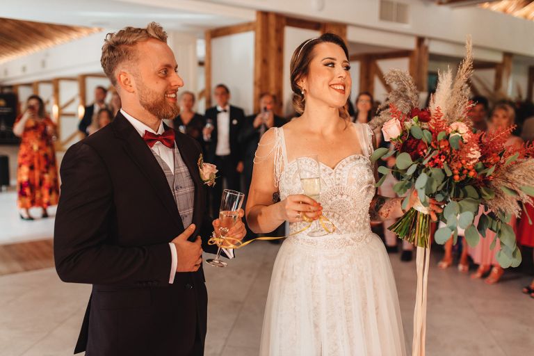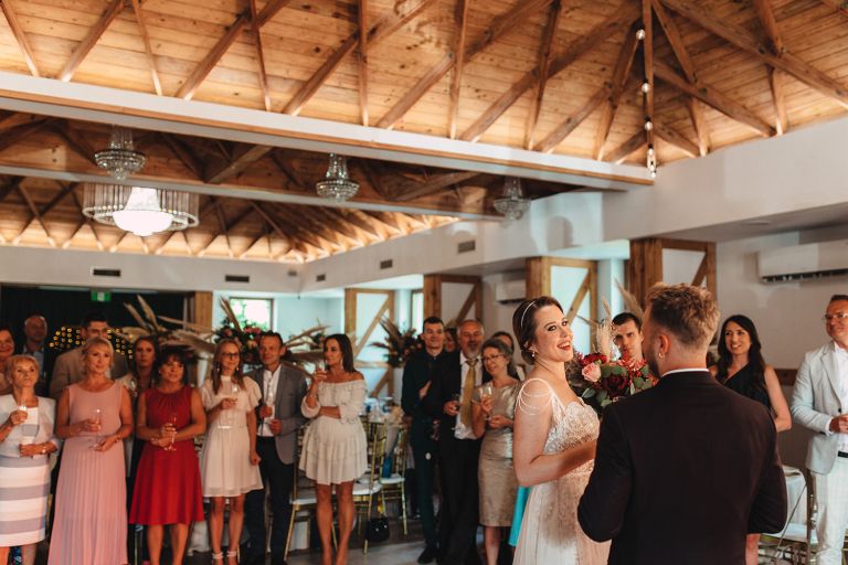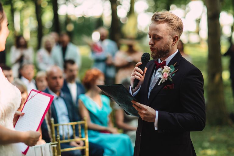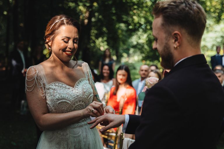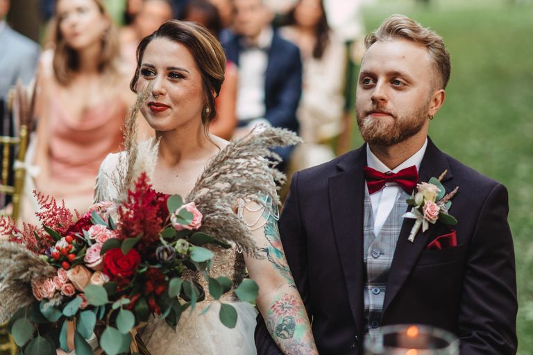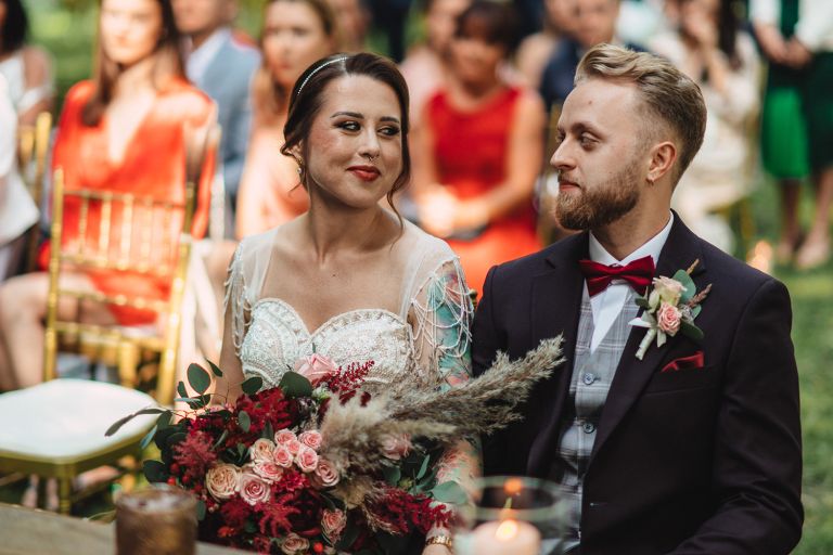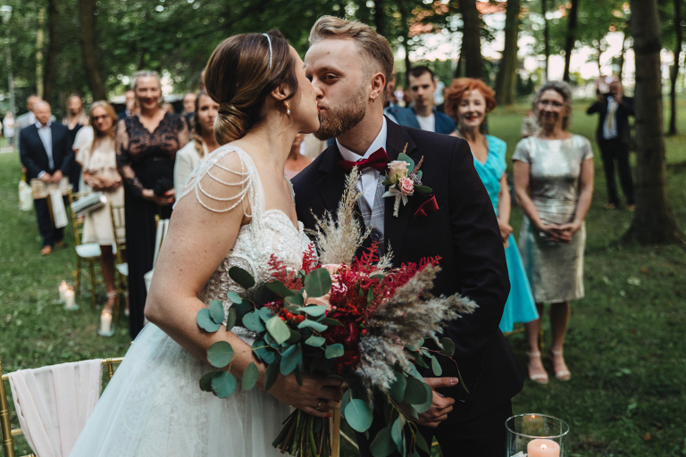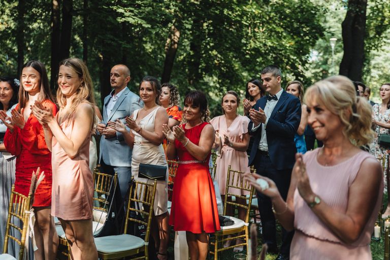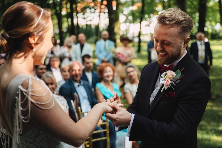 Ślub odbył się w konwencji humanistycznej. Głównym momentem były przysięgi – samodzielnie napisane przez Parę Młodą. Były piękne, szczere, wzruszające. To jeden z tych momentów, gdy cała sala wstrzymuje oddech. W oczach gości pojawiły się łzy – i trudno się temu dziwić.