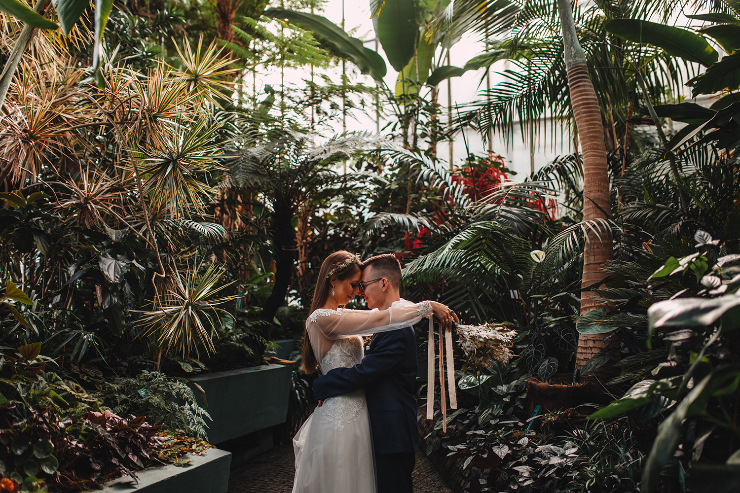 Sesja ślubna w Palmiarni Gliwice – zieleń, światło i romantyzm pod szkłem