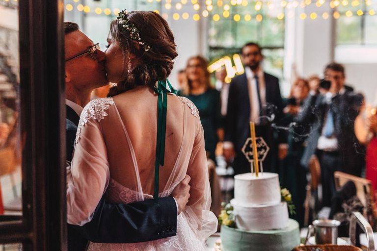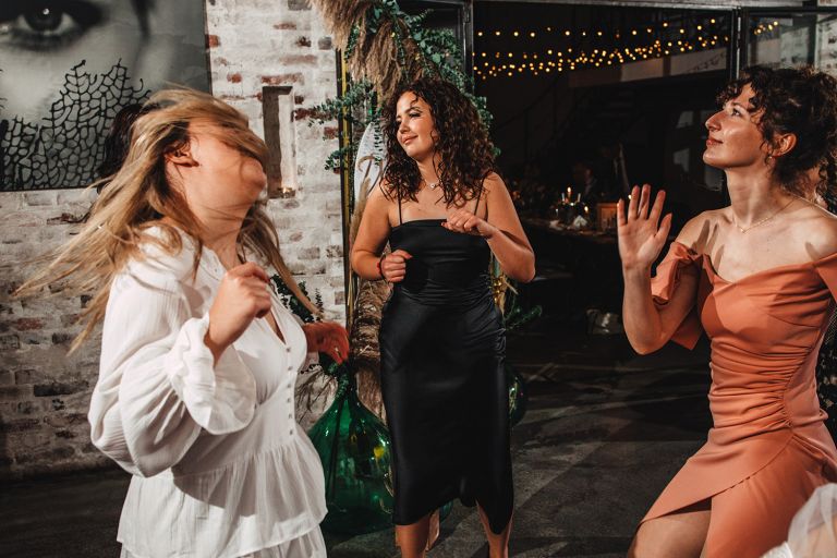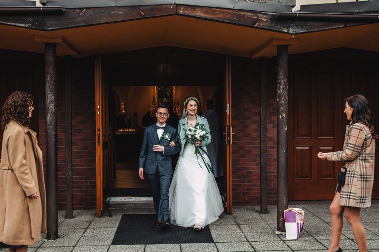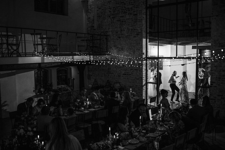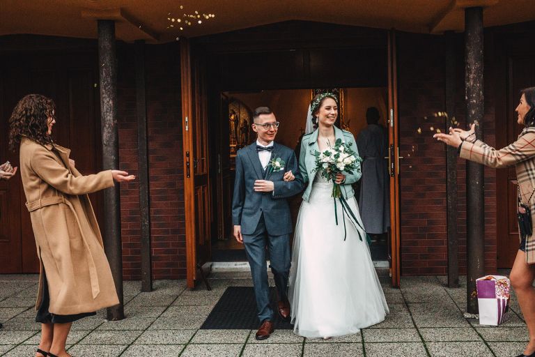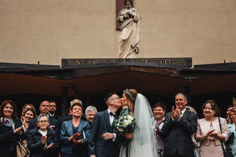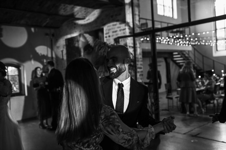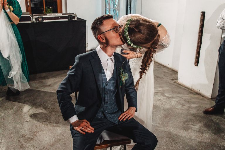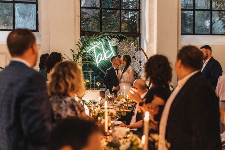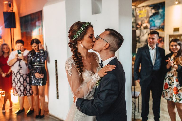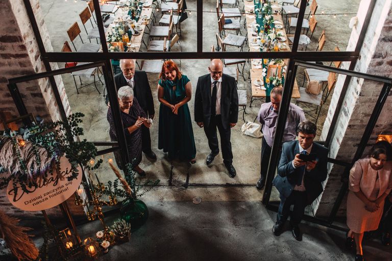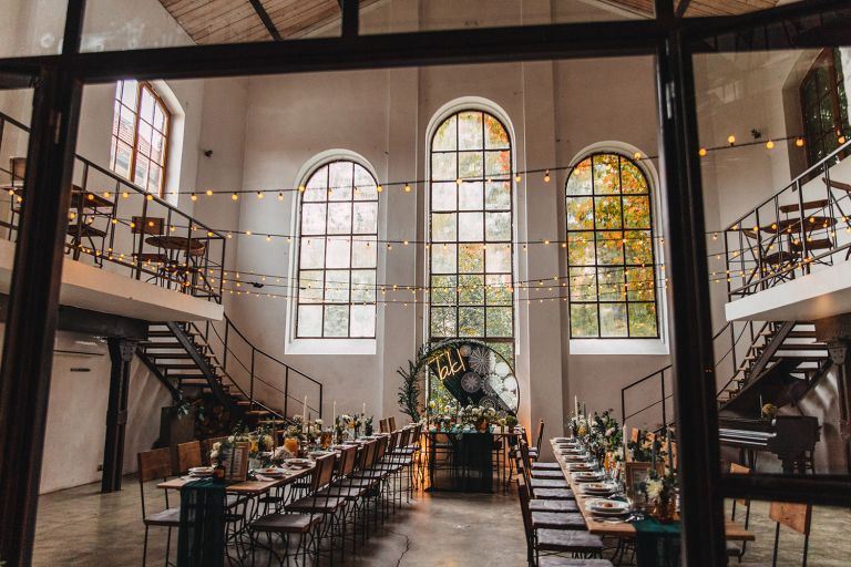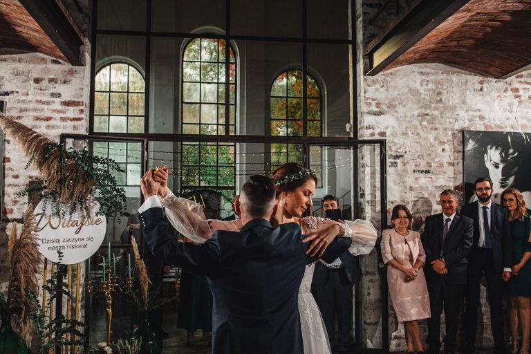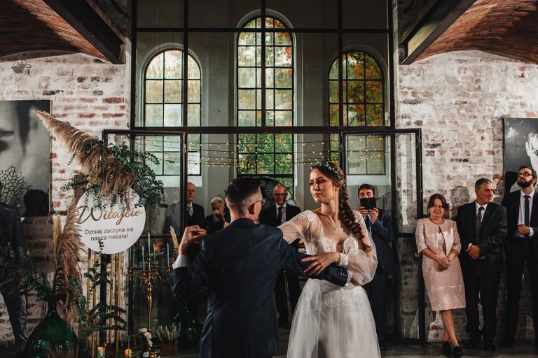 Przyjęcie Kasi i Szymona odbyło się w Restauracji Impresja – miejscu z historią. Wnętrza tej dawnej łaźni Huty Zabrze zachowały surowość betonu i cegły, ale równocześnie były pełne światła i przestrzeni. Z zewnątrz budynek przyciąga wzrok fasadą porośniętą zielenią, a w środku króluje industrialny styl z duszą.